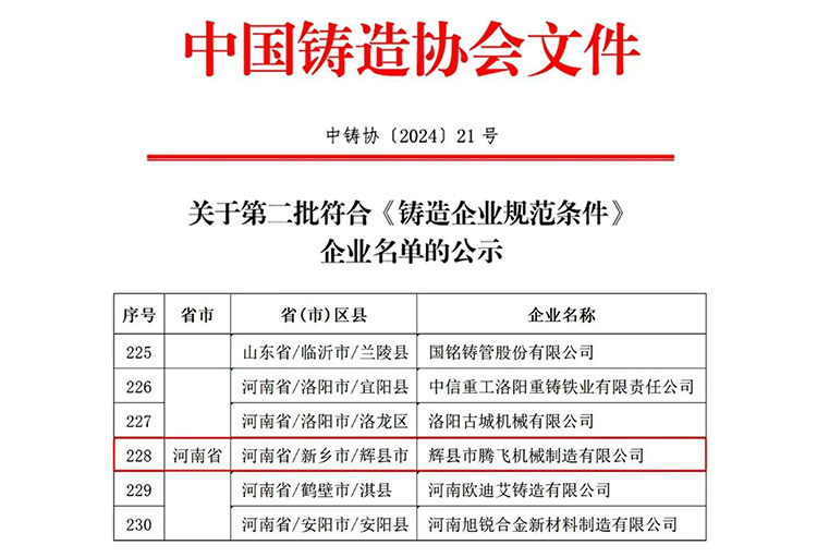 9月11日,中國(guó)鑄造協(xié)會(huì)官網(wǎng)公示了“第二批符合《鑄造企業(yè)規(guī)范條件》企業(yè)名單”,輝縣市騰飛機(jī)械制造有限公司榮登榜單。
